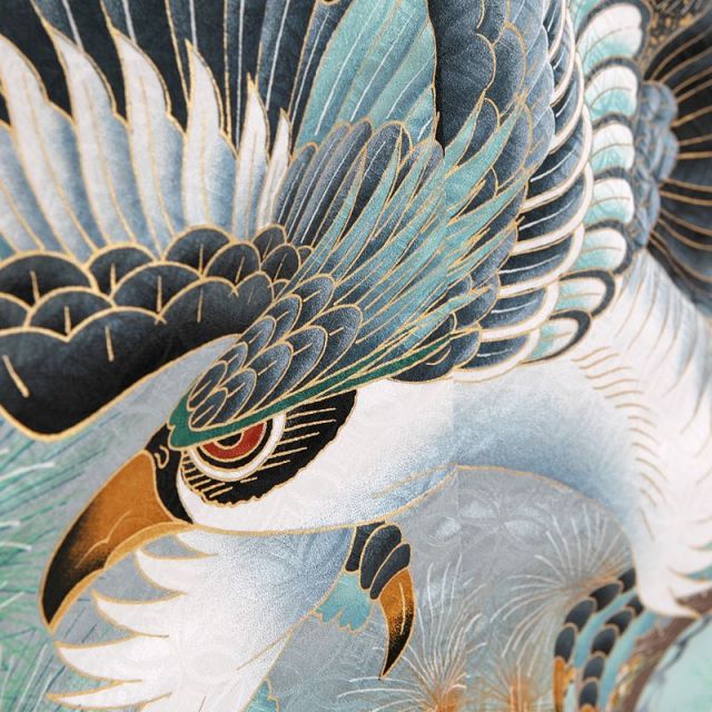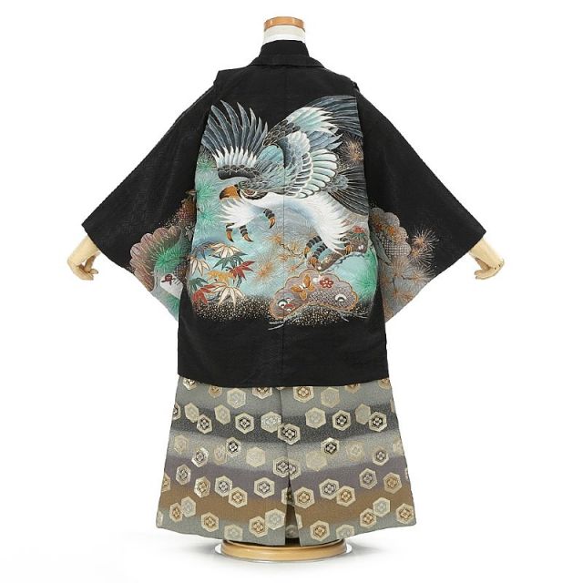 このグローバル時代に生を受けた男の子ですから、社会の荒波を乗り越えて、立派な大人になってほしいと願う親御さんも多いことですよね。そんなママのお気持ちに応えたかのような文様が特徴的な羽織袴になります。羽織の地紋は、円をつなげた連続文様の七宝文です。特に光沢のある緑のグラデーションが描かれている箇所は地紋の七宝文がうっすらと浮かび上がり、お着物全体を格調高いものにしてくれます。七宝文は物事が何事も円く収まる・円満になるということから、子孫繁栄・出会いによる良い関係を築き上げるといった意味を持った文様になります。背中には羽を広げた鷹が、今にも飛び立ちそうです。力強い眼で獲物を見定めているさまは、物事の本質を見極める力をもってほしいという願いがこめられています。また獲物を掴む強靭な爪は強運や幸運を決して離さないという意味です。鷹はお子様の健やかな成長や将来の出世につながってほしいという、まさに男の子の大成を願う心を表しているでしょう。鷹の背景には、おめでたいしるしとされる吉祥文様の松竹梅があしらわれています。特に松は、笠松や針松など様々な図案に意匠化されて描かれており、より重厚感や威厳を感じさせます。袴に散りばめられているのは亀甲花菱文です。亀甲は亀の甲羅をデザイン化したもので長寿を意味しています。亀甲の中に優美な花を描いた花菱模様が加わり、袴をより優美な印象に仕上げています。お子様の成長や将来を願うのに相応しい羽織袴です。伝統文様の羽織袴を着たお子様は、ママの眼差しには、とても凛々しい姿に映っていることでしょう。