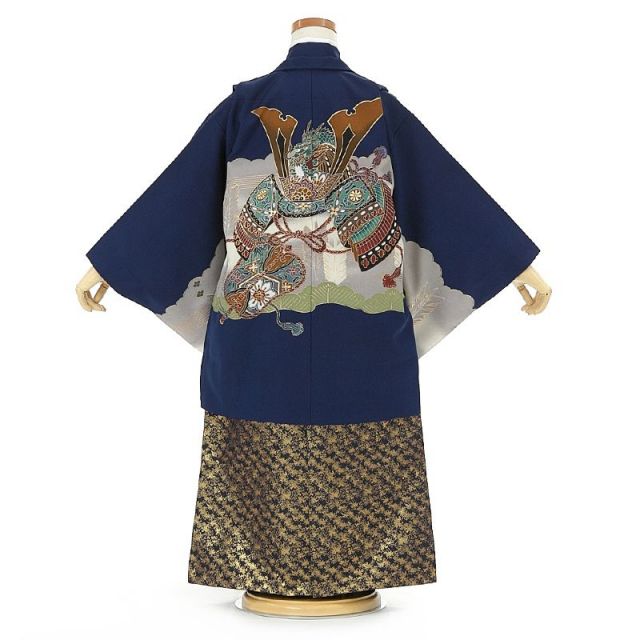 羽織は紺色を基調としており、厳かな雰囲気を醸し出している中で、背中の大きな兜と軍配が目を惹きます。男の子には将来、大成や出世してほしいと願うのが親心。それには丈夫で健康であることが必須条件です。背中の兜には2つの願いが込められています。大切な頭を守る兜は災厄から身を守り、元気に健やかなに育ってほしいと願うお守りの役目を担います。豪勢な飾りが施された兜は、それだけで位の高い人物を意味します。勇ましくて、立派な大人に成長してほしいというお子様の将来を願う心もあります。また兜の上には龍が鎮座しており、兜は龍頭の兜(たつがしらのかぶと)とも呼ばれます。天に昇る姿から出世や飛躍を願う意味をもつ龍をかたどることで、威厳と風格を感じさせる兜になっています。袖と背中には、豪華に飾られた軍配があしらわれています。軍配を持つ人物は勝負の決断を下す立場です。これからの人生で、困難な状況になっても立ち向かえる決断力を養ってほしい、勝負の采配に強い子に育ってほしいという力強い願いが込められている文様といえるでしょう。兜や軍配などの大きな文様を囲うように矢羽が描かれています。矢羽は“魔を払い幸運を射止める”お守りであり縁起の良いものになります。袴は金と黒の鮮やかな色彩で彩られ、七五三の良き日をより強調しているようです。子供は、いつかは親から離れ自分の人生を歩む時がきます。伝統文様に込められたママの思いに護られながらも、しっかりと逞しく進むべき道を歩んでいけるように。お子様の健やかな成長と将来の大成を願う羽織袴で、めでたい晴れの日をお祝いしましょう。