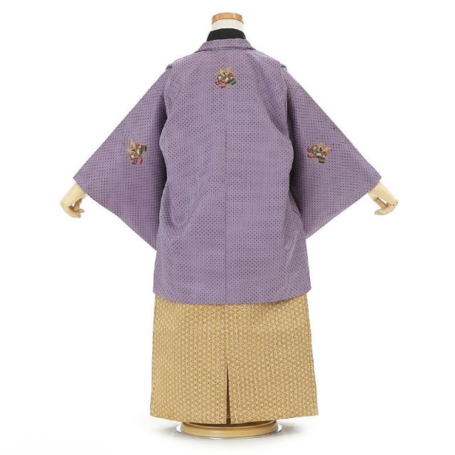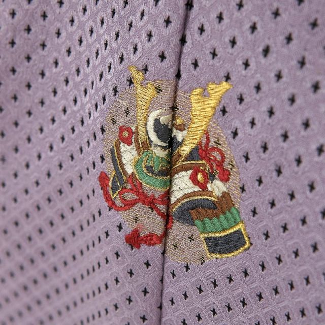 他ではなかなか見かけない紅藤色の羽織です。花の藤から派生した色の中でも、赤みがかった紅藤色は、“若藤色”とも呼ばれ、特に江戸時代後期に人気の博した色になります。少し透け感のある羽織の地紋は、鹿の子紋の中に十字に抜かれた模様が特徴的。羽織の中に着た漆黒のお着物が浮かび上がっているように見える、手の込んだデザインとなっております。背中・両袖の後ろ・両胸元に兜の絵が紋の大きさであしらわれていますが、まるで五つ紋付きのお着物のよう。着物に紋が入ると着物の“格”が上がりますが、五つ紋は最上格にあたり、婚礼や格式の高い式典の際に着るお着物になります。五つ紋風の兜があることで、羽織をより風格のある存在に仕立てています。兜には災いから身を守り、元気に育ってほしいと願うお守りの意味と、将来、立派な大人に成長してほしいという大成を願う意味が込められています。袴は、クチナシ色に近い黄色に麻の葉文様となっております麻は成長が早く、しかも丈夫に真っすぐ育つので、お子様の健やかな成長を願う紋様です。個性的でありながらも、優美な色と意匠高いデザインに魅了される羽織袴。この羽織袴を着こなしたお子様に、きっと目を奪われてしまいます。