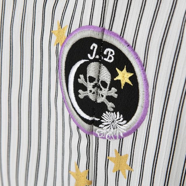 古き良き伝統を守りながらも、常に進化し続ける人気ブランド“JAPAN STYLE”より1度目にしたら目を離すことができない、斬新な羽織袴の登場です。ビシッと決めた漆黒のお着物の上には、ドクロと六芒星のデザインが異彩を放つ羽織を身にまといます。しかしインパクトが強いだけではなく、大切な意味が込められた羽織でもあるのです。黒の金通縞が“いなせ”な羽織は、黄色の六芒星とドクロなどがあしらわれた“紋”のような刺繍が特徴的です。六芒星は古来、日本に伝来してから『魔除け』として陰陽道や民間信仰に浸透していきました。六芒星をつなげた連続模様を日本では籠目文様といい、悪霊は、たくさんの目がある籠目を怖がるので、厄除けの文様とされています。ドクロといえばハロウィンの仮装のシンボルですが、悪霊が乗り移らないようにわざと悪霊仲間に見立てた仮装をする、つまりは厄除けのためです。ドクロは厄除けと再生の意味を持ち、日本にも昔から存在する縁起の良い柄になります。ドクロとともに、三日月や菊の花の刺繍が加えられています。三日月は幸運を運び災いから守ってくれるといわれ、菊は無病息災を意味する文様です。あまたのパワーを有する羽織袴を身に付ければ、どんな災厄も寄り付きません。ママの1番の願いは元気なお子様が、病気やケガをせずにずっと健康で育つこと。七五三の晴れの日は、力強い願いが込められた文様を味方にして、ロックテイストでカッコよく決めてください。