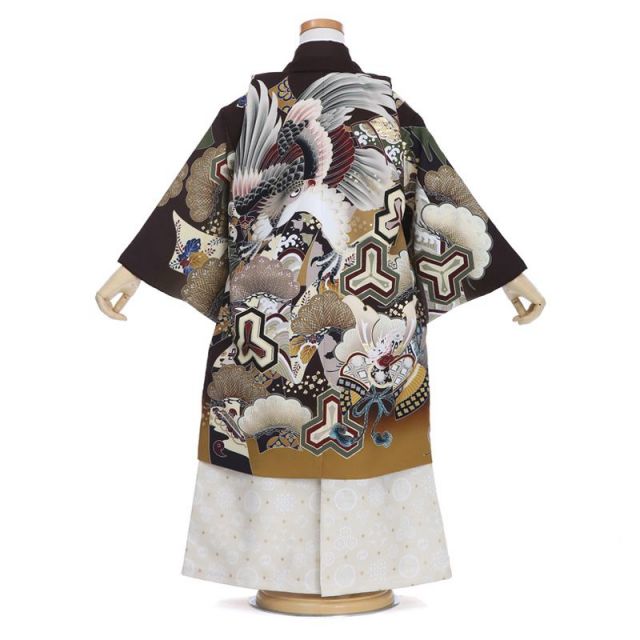 ブラウンを主体として伝統的なイメージを大切にした絵柄がふんだんに散りばめられた男の子らしいお着物です。お子さまのこれからの健やかな成長を願う吉兆文様が盛り込まれています。例えば、背中に大きく描かれた鷹は大空高く舞い上がり、地上の小さな獲物を見逃さずに、素早く正確にがっちりと捕らえるので、出世や武功を得る縁起物とされています。また、兜は戦の時の道具ではありますが、大切な頭を守ることから「魔を避ける」「災厄から守る」という意味があります。三つ又に分かれた文様は「毘沙門亀甲」といい、3つの亀甲文様を繋げた図案です。財宝富貴を守る武神である毘沙門天が武具に使用した文様なんですよ。亀甲は長寿の意味がありますが、そこにさらに福財をもたらす神の力が加わり限りなくおめでたい文様になっています。この他にも、波千鳥(なみちどり)、桐、松、青海波、勾玉、七宝文様などの吉祥文様でお子さまの成長への願いが込められています。伝統的で勇ましい男の子らしいデザインはお子さまの成長の節目を祝う七五三の晴れ着にふさわしいですね。ブラウンは日本人の肌色になじみやすく、どのようなお顔立ちのお子さまにもよく似合う万能のカラーです。
