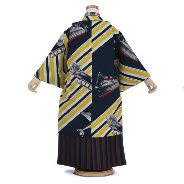 着物をファッションとしてとらえ新しい感覚で着物をデザインするモダンアンテナがリリースした七五三向けのお着物です。先進的なデザインですが、京都の着物職人たちと技術提携をしているので品質の面でも安心できますよ。今にふさわしい着物をクリエイトするモダンアンテナだからこそできる型破りでおしゃれなデザインは個性的なお子さまにぴったりです。羽織には船、車、飛行機といった男の子が大好きな乗り物が描かれています。一見奇抜な文様ですが、道具や生活用品を描くことは器物文様と言って平安時代から使われてきた手法なんですよ。好きなものを絵柄にして身に付けていたいという想いは昔から変わらないんですね。個性的な羽織に合わせて、中に着る着物にもカラフルで楽しげなものをコーディネートしました。縁起の良い吉祥文様がふんだんに散りばめられてお祝い着にふさわしいおめでたいデザインとなっています。他の子とかぶらない特別なデザインの晴れ着を着せてあげたい方や、乗り物が好きでこだわりが強いお子さまにおすすめです。一生に一度の特別なお祝いにとびっきりのおしゃれをしてみましょう。