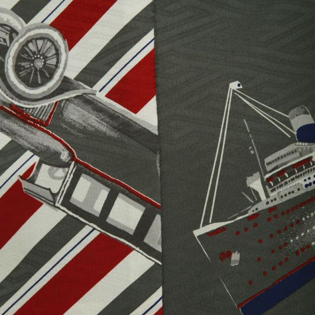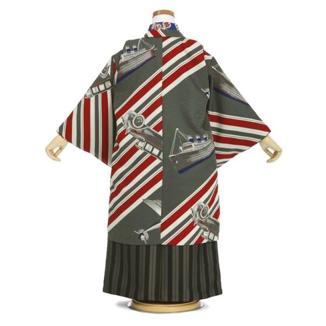モダンアンテナは現代的なモダニズムやコンテンポラリーデザインを着物に落とし込むデザインスタイルで革新的なデザインの着物を世に送り出してるブランドです。そんなモダンアンテナが七五三の晴れ着をデザインしました。モダンアンテナらしい刺激的でおしゃれなデザインですね。男の子が大好きな乗り物をレトロで可愛くデザインし絶妙なバランスで和と洋を調和させています。文明開化をしたばかりの明治時代のような印象があるモダンなデザインですね。色味を抑えた色調でシックな印象をプラスしているので奇抜になりすぎず、伝統的なイベントにふさわしい品格を損ないません。羽織の地布には紗綾形(さやがた)と呼ばれる吉祥文様を織り込んでいます。仏教で用いられる吉祥の印である卍(まんじ)が限りなく続く紗綾形は家の繁栄や長寿などの意味が込められています。かすかに見える紗綾形がお着物に深みのある印象を与えてくれます。ただ奇抜なだけではなく伝統にのっとった礼服としての原則を守るデザインは、しきたりを受け継ぎつつ新しい未来へと歩みを進めるお子さまの成長のお祝いにぴったりです。5歳の年頃だからこそ着こなせる元気いっぱいのキッチュなおしゃれを楽しみましょう。
