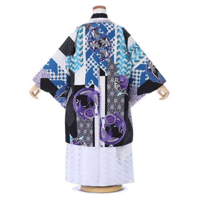 澄んだ青が基調の羽織とクールに輝くシルバーの袴がカッコいい男の子らしい礼服です。清潔感と豪快さが両立したデザインはワイルドなことが好きなお子さまにぴったりですね。ファッショナブルなデザインですがしっかりと伝統にのっとった意匠がほどこされています。さまざまな模様が描かれている地の絵柄はそれぞれにおめでたい意味が込められているんですよ。例えば紗綾形(さやがた)は不断長久、麻の葉は子どもの健やかな成長、石畳は永遠に続く様子を意味しています。また、踊るように戯れる鶴と亀は長寿を意味する伝統的な吉祥文様です。2匹が円を描くようにデザインされているのは円=終りがない様子を表現しているんですよ。長寿の終りがない様子は永遠に続く繁栄を意味します。個性的で目を引くデザインですが、そのひとつひとつを見てみると伝統的で子どもを想う願いが込められているんですね。はでやかな羽織を引き立たせるために中に着る着物にはシックな黒を合わせております。黒は最も格式の高い色なので、全体の品格を上げていますね。伝統と個性を両立するお着物はおしゃれなお子さまのお祝いにぴったりです。