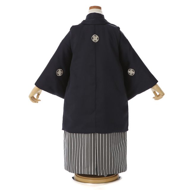 近年は、様々なデザインの七五三のお着物が多い中で、あえて日本伝統のスタイルを貫くことがカッコいい!!と思わせる一着です。こちらのお着物は、男性の和装において最上格の第一礼装“黒羽二重五つ紋付”(くろはぶたえいつつもんつき)と言われる羽織と仙台平(せんだいひら)という縞袴となっております。お着物に一つ紋、三つ紋と紋が入ると“格”が上がりますが、最上の格は、背中・両袖の後ろ・両胸元に紋が入った五つ紋付きのお着物になります。袴は仙台平と言われる縞模様で、縞の袴は格式が高いものとして、儀式の際に着用するのに相応しいものです。縞は太い方が若い方向きといわれており、太めの縞模様となっています。凛々しい中にも元気いっぱいなたくましさが感じられます。5歳は初めて袴を身に付ける“袴着”の儀式です。そんな大切な節目の日に、格と伝統に満ちたお子様を見れば、ママもきっと惚れ惚れすることでしょう。