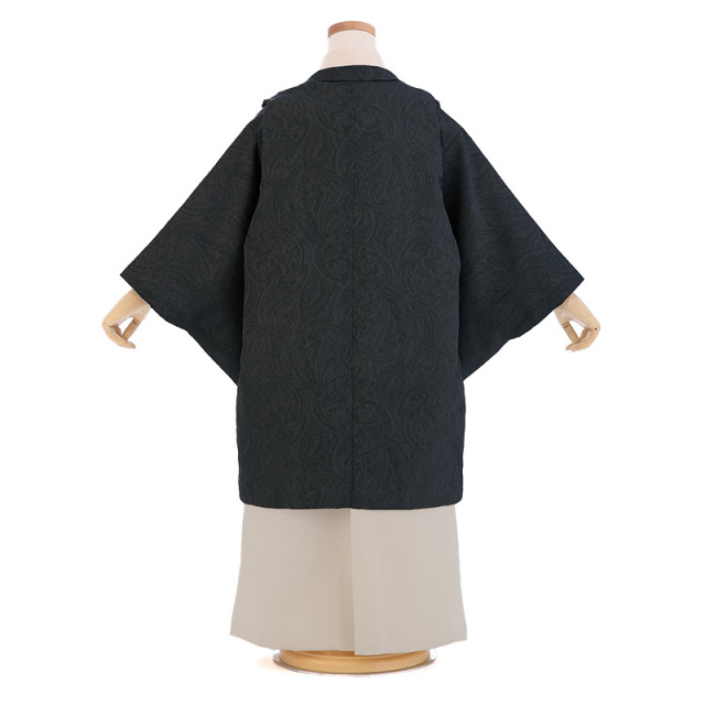 クールなブラックの羽織と、エレガントなペイズリー柄が特徴のこの七五三のお祝い着は、シンプルながらも華やかさを感じさせるデザインです。羽織のブラックカラーは「墨色(すみいろ)」で、深みのある落ち着いた色合いが特徴です。ペイズリー柄はインドのカシミール地方発祥のもので、洗練されたディティールが全体に上品な印象を与えます。ジャガード生地のアイボリー色の着物にも同様のペイズリー柄が施されており、全体の調和がとれています。袴のベージュグレー「象牙色(ぞうげいろ)」は、シンプルでありながらも高級感を演出します。このお祝い着は、洋服に近い感覚で季節を問わずに着用でき、お子様の個性を引き立てます。ブラックの羽織が持つ格調高い雰囲気とペイズリー柄の繊細さが、お子様の成長を祝う特別な一日をより一層華やかに彩ります。控えめでありながらも品格のあるデザインで、特別な日を優雅に演出します。