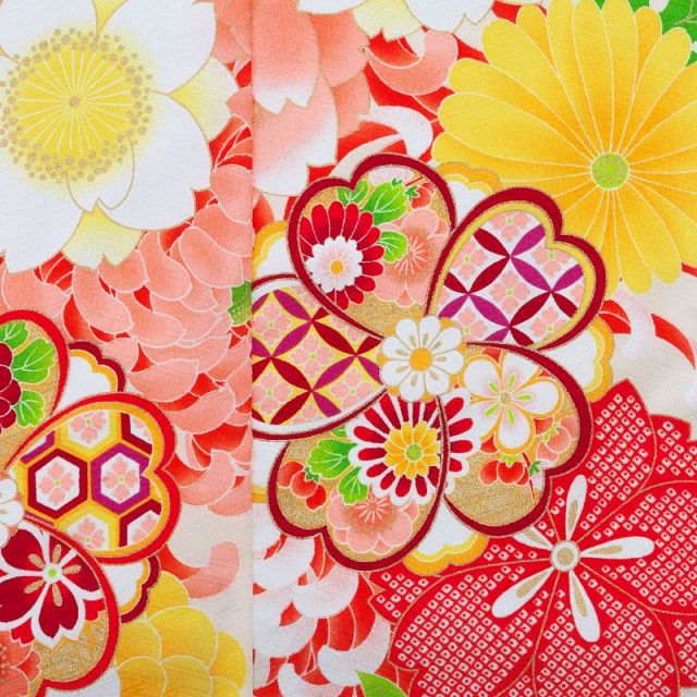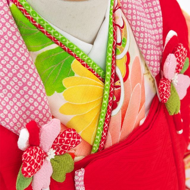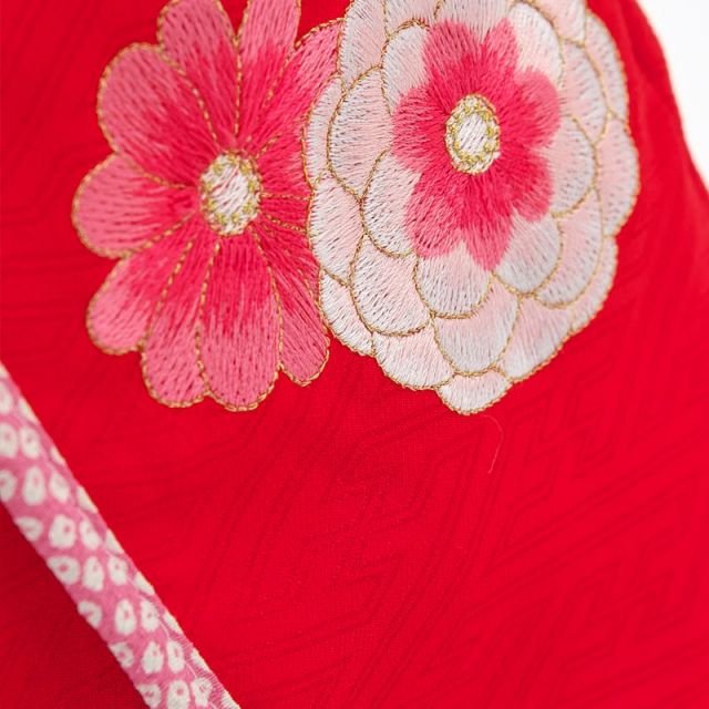 式部浪漫ブランドが誇る、古典的でレトロな可愛らしい花々がちりばめられています。裾もとに描かれている淡いピンクオレンジの菊花は、不老不死、延命長寿、無病息災、邪気祓いの意味を持つ“菊文様”で、日本皇室御紋でもあり花文様の中でも最高位の花として大変好まれています。その横には、日本古来より愛されてきた国花の“桜”が描かれています。桜木は、神の宿る木とされ「五穀豊穣」や「豊さ」を表しています。大輪の桜はまさにお子様のより豊かな幸せを願う絵柄です。桜をかたどった模様の中にも深い意味のある模様が描かれています。生六角形を上下に繋いだ幾何学模様は、亀の甲羅に似ていることから、“亀甲(きっこう)”と言われています。鶴と同様に「長寿」の象徴で非常に縁起の良い柄として長年愛されています。「高貴」「上品」の意味合いを持つ“花菱(はなびし)”は、有職文様(ゆうしょくもんよう)と言い平安時代の宮中の儀式や行事に関する研修者や学者が身に着けていたことから格調高い文様として用いられてきました。お着物に羽織る“被布(ひふ)”には、ピンクの糸で刺繍された“菊文様”が可愛らしくほどこされています。被布の胸元には、桜のお飾りがぷっくりとあしらわれており、可愛らしさを引き立ててくれています。
