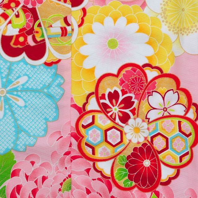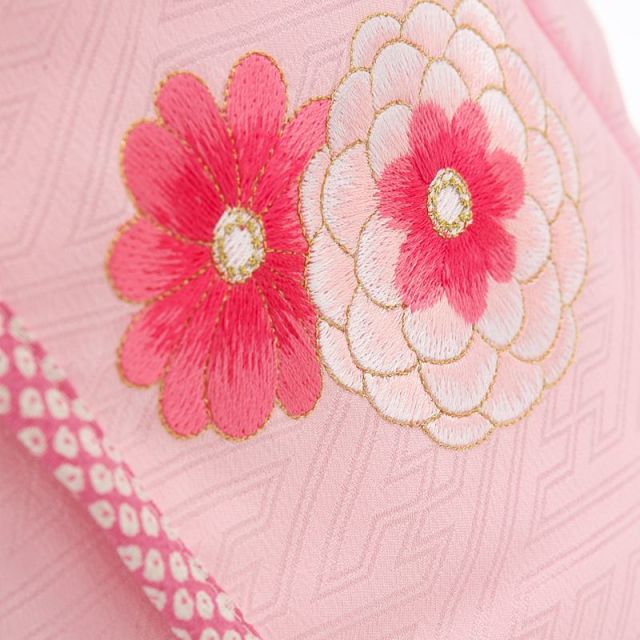 3歳だからこその可愛らしさを華やかに彩る、大きな花柄が目を引く着物です。大らかに描かれた桜と菊。桜の花びらの中には、さらに小さな桜と菊や、宝尽くし、亀甲文様、七宝文様といった吉祥文様が描かれるという、手の込んだデザインです。宝尽くしは言わずと知れた縁起の良い文様。亀甲と七宝も、いずれも平安時代から公家の装束等に用いられた有職文様であり、おめでたい席に用いられる吉祥文様です。被布は、着物がこれだけ華やかなこととのバランスから少し控えめに。女の子が大好きな淡いピンク色の地に、正面には長寿を象徴する菊の花を刺繍でほどこしました。桜の花や被布に用いられた疋田絞り(鹿の子絞り)の柄も、お嬢さんらしさを添えています。七五三から十三参りそして成人式へと、お着物をお召しになる機会は何度かあれど、少しずつ色遣いや柄の大きさ等控えめになっていくものです。3歳の七五三らしいこちらの着物は、心に残る1日を豊かに彩り、そしてアルバムの1ページにも華やぎをもたらしてくれることでしょう。