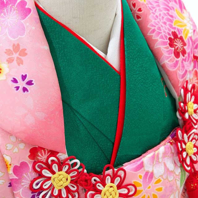 繊細な地紋が美しい上品でなめらかなエメラルドグリーンの地色に、ぼかされた桜花でかたどられた幻想的な色とりどりの花畑の間をひらりひらりと舞う胡蝶を染め出した着物です。胡蝶は愛らしいだけでなく長寿のシンボルでもあり縁起が良いことから、その舞う姿は歌舞伎や能楽にも登場します。桜吹雪が織りだされたベビーピンクの地色の被布には、美しい大輪の芍薬と楚々とした菊がこぼれんばかりに活けられた花車が。桜花咲きほこる愛らしいモチーフの中に見え隠れする様子にひそやかな物語性が感じられます。胸元の深紅の房の付いた花結びの組み紐飾りも、コーディネートに華やかさと立体感を加えています。夢見るように愛らしい被布とロマンティックな胡蝶の着物の装いで、お子様の新たな一面が見られるかもしれません。