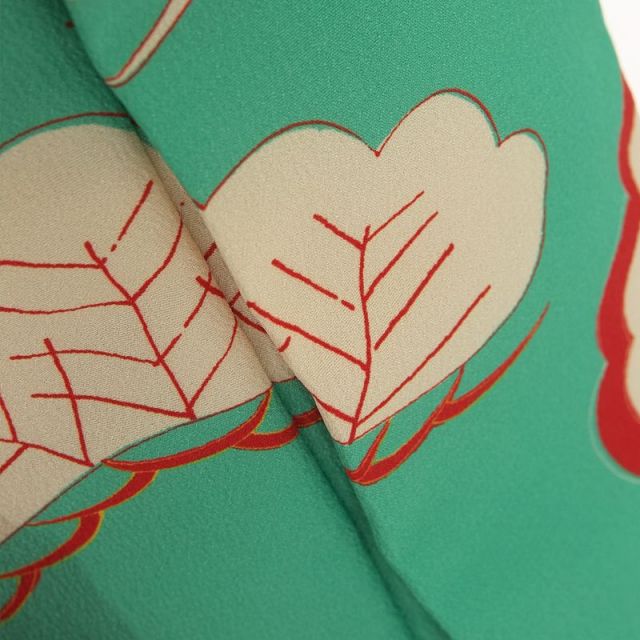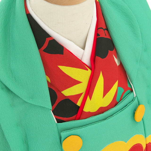赤い地色に白、黒、黄、緑とはっきりとした力のある色遣いが印象的な着物です。そんな着物の柄は、よく見ると松、竹、梅と橘という、あくまで古典的な取り合わせ。松竹梅はおめでたい柄の定番ですが、橘も古事記に登場する、縁起の良い植物。不老不死の理想郷に生えているといわれ、長寿を象徴する文様です。そんな橘は実は蜜柑のことですが、ふっくらした実が意匠化されていることから、丸々とした愛らしさや豊かな実りも連想させます。被布は、着物の柄にもあるこっくりした青緑色のものを選びました。柄も着物からもらった松の柄。細かな柄で埋め尽くされた着物とバランスをとるように、大きな松を3つだけ描き、あとは余白を生かしました。着物と被布の色の繋がり、柄の繋がり、そして細かな柄と大きな柄の組み合わせ、着物の取り合わせの鉄則が詰め込まれた装いです。モダンな装いでも、いつの時代も変わらない、お子様の健やかな将来を願う心を込めて、晴れの日をお過ごしください。
