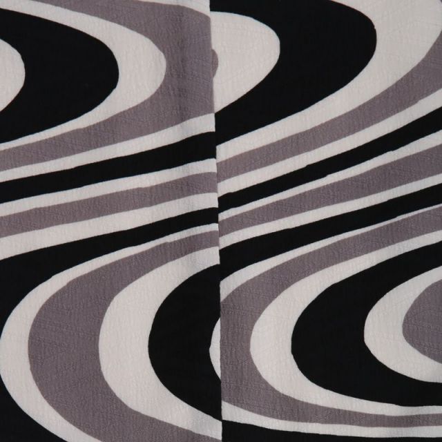 ブラック、オフホワイト、シルバーグレイの3色のボーダーがエレガントな曲線を描く、流水紋のような、マーブル模様のようなシックな着物と、オペラピンクの水玉ちりめん地に白鳩が羽ばたくキュートなデザインの被布のセットです。紗綾形文様が織り込まれた着物は、ダイナミックな縞模様が波打ち、大人でも着てみたくなる都会的でモダンな雰囲気がたっぷり。重ね襟や裾、袖口からのぞく真紅のアクセントがお祝いの装いにふさわしい華やかさをプラスします。優雅に羽ばたく白鳩と休む愛らしい鳩達が印象的な被布は、オペラピンクの地色によってメルヘンティックな物語性が感じられ、まるで絵本の1ページのような想像力を掻き立てられる一枚です。正式な記念写真だけでなく、ジャンプやダンスなど動きのあるポーズにも映えるので、お子様のいろいろな表情を演出できるでしょう。京都発、着物好きなら知っている「モダンアンテナ」のスタイリッシュで個性的な七五三セットです。