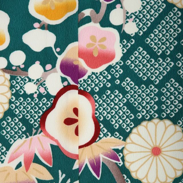 葛飾北斎をはじめ数々の復刻制作をし、世界の評価も高くエルメスのカタログ「ル・モンド・エルメス」の表紙と巻頭特集も飾ったUNSODO(芸艸堂うんそうどう)。明治24年、木版摺技法による美術出版社として創業しました。伝統ある木版をする日本唯一の老舗です。 お着物には伝統ある様々な文様が描かれています。 長寿の象徴である“菊文様”は、無病息災、邪気払い、心身を安定するなど様々な意味を持っています。丸い形が太陽を思わせることから、花柄の中でも最も位の高い花として用いられています。 “梅”の花は、厳しい冬を耐え忍びのちの春に美しい姿を見せてくれる「忍耐力」「美」を表す、美しくも力強い花としてお祝い事には欠かせない文様となっています。 竹の“笹”の葉は、冬にも瑞々しい緑の色を変えないことから不変、長寿の意を表す良い文様です。 お着物に羽織る被布(ひふ)には、常盤木(ときわぎ)と呼ばれる椿の花があしらわれています。古来より縁起の良いものとされ、聖なる木、厄除け、樹齢が長いことから霊木とも言われ、不老長寿も意味しています。神秘的で不思議な魅力のあるお着物は晴れの日を華やかにしてくれることでしょう。