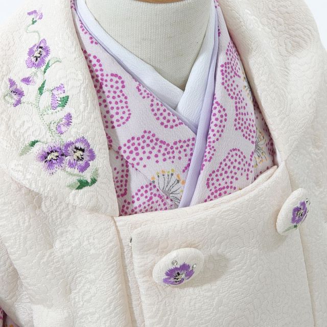 「CUTE×PRETYY×ROMANTIC」(すべては女の子の“かわいい”のために)をコンセプトに、フェミニンでいて繊細さと強さが共存した、表情豊かなコレクションです。世界中の女の子たちからは絶大な人気を誇るJILL STUART(ジル・スチュアート)は、繊細で品のある色使いの花々がちりばめられた「女の子なら誰でも着てみたい」ファッションブランドになりました。 トレンドに敏感でコーディネート上手な女の子がイメージのJILL STUART(ジル・スチュアート)のお着物は薄紫の色と被布(ひふ)の色使いがとてもデザイン性を感じさせてくれます。お着物に敷き詰められた花々は「お花に囲まれてみたい」女の子の気持ちを満足させてくれます。 薄紫の花々は、「宇宙」「高貴」「上品」「癒し」の意味があります。上品でいてしかも高貴な表現のあるお着物、お子様の将来にわたり人々を癒し上品でいて欲しい親の願いがこもっています。 お着物に羽織る被布(ひふ)は、ジャガード生地にアンティーク調の刺繍がほどこされており、胸元にはビジュー付きのボタン飾りをつけて新しくて懐かしいデザインになりました。 晴れの日をフェミニンなお着物で大切なアニバーサリー(記念日)をご家族みんなでお祝いしましょう。
