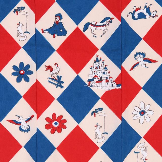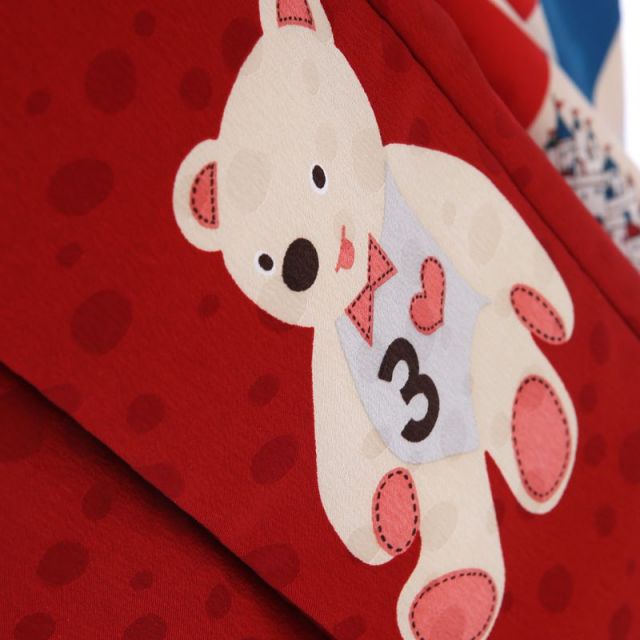 伝統だけにとらわれず、常に未来志向なデザインを発信しているブランド、”モダンアンテナ”のお着物と被布着です。着物をより楽しんでもらえるようにと思いを込めて作られる作品は、他の追随を許さないオリジナリティあふれるスタイルが特徴です。お着物は、ちょっぴりレトロ感のある朱と紺とクリーム色の柄で織りなされています。柄は伝統的な文様の菱形ですが、しかしながら、まるでトランプのダイヤ柄といってもしっくりきます。菱形は、繁殖力の強い植物『ヒシ』に似ていることから名づけられた文様で、『子孫繁栄』の願いが込められています。またトランプのダイヤマークはお金や財力を表しており、どちらにしてもお子様の成長を喜ぶ晴れの日にぴったりのお着物です。クリーム色の柄にはヨーロッパの絵画のようなデザインが施されていて、女の子のおしゃれ心をくすぐります。被布にはちょこんと座っている可愛い白くまがパッと目を惹きます。しかも、正面の画像だけでは分かりませんが、後ろに、被布のくるみボタンと同じ白いふわふわのしっぽがついているんです。どの角度からお子様の写真を撮っても、可愛く写ること間違いなしです!