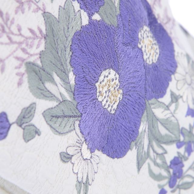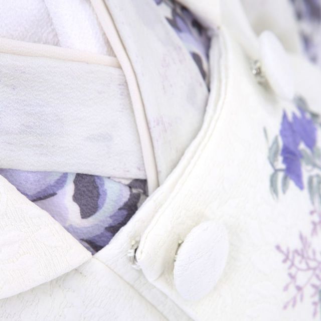 お着物に羽織る被布(ひふ)に描かれているお花は「無邪気」を意味する“アネモネ”です。英語では「windflower(風の花)」の別名で呼ばれています。JILL STUART(ジル・スチュアート)のファッションは、「誰もが一度は着てみたい」世界中の女の子の“かわいい”のためにデザインされ洗練されたブランドです。「ふわふわ」「かわいい」をモチーフにデザインされている作品が多い中、このお着物は純真無垢な少女が“洗練された大人の女性への成長”を表現されているようです。白の地色に縦ラインのファンシー(高級・豪華)なバラの花をあしらうことで、純真な少女の中にも華麗な大人っぽさを表現しているのはJILL STUART(ジル・スチュアート)ならではのファッションセンスですね。青色のバラの花言葉は“夢かなう”“奇跡”“神の祝福”の意味があります。「神に祝福され、将来夢がかないますように」との親の願いがこもっているのでしょうね。一生に一度の七五三は、ファンシーなJILL STUART(ジル・スチュアート)のお着物を着て大切な日をお祝いしましょう。
