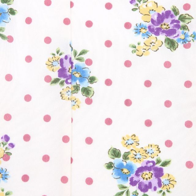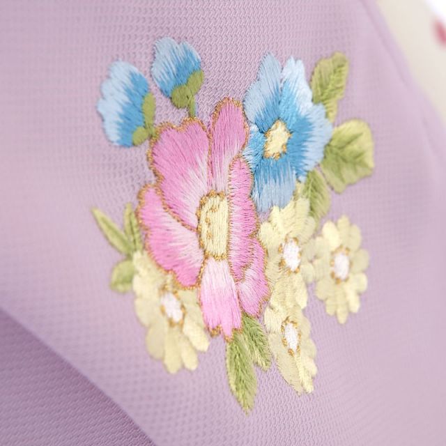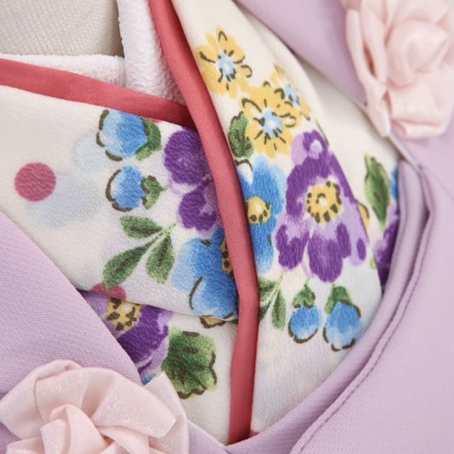 甘い色遣いで水玉と花柄という女の子の特権のモチーフを描いた、甘く可愛らしい装いです。白地にピンク色の水玉模様。洋服であればそれだけでも十分可愛らしい地の上に、甘い雰囲気のお花を散りばめた、ロマンチックな着物です。お花はパンジーをイメージしたものでしょうか。洋風のデザインですので、何のお花ということはなく、デザイン化されたものですが、紫色、水色、黄色という反対色をきかせた組み合わせは、思わず視線を奪われる色遣いですね。地が白とピンクの水玉という甘い雰囲気のところ、お花の色が少しクールな雰囲気であるところも、絶妙です。被布は、澄んだ淡いラベンダー色が印象的です。こちらも、着物と似たような雰囲気の、デザイン化された洋花を散りばめたもの。着物は、花も沢山ちりばめられ、地の水玉模様もある、全体柄ですので、被布の方がこのように控えめで、ポイント的にいくつか花が描かれているだけというのは、とても良いバランスです。被布の花は刺繍でほどこされているため、立体感があり、着姿全体のめりはりに繋がります。とっておきの晴れの日、お嬢様ご本人が喜んで着てくれそうなこんな装いはいかがでしょうか。