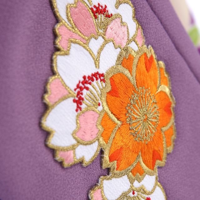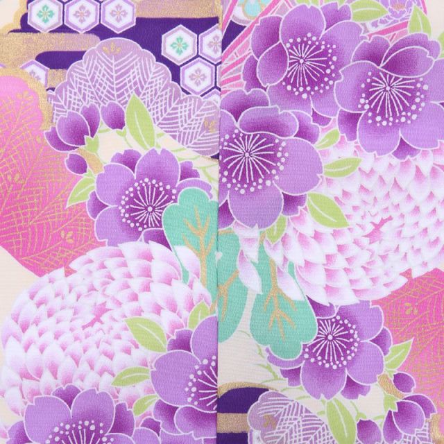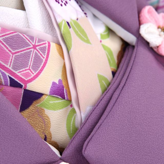 桜、菊、七宝、亀甲といった古典的な文様が散りばめられた、華やかな装いです。淡く優しいクリーム色の地の上に描かれているのは、桜、菊という日本を代表する花々と、七宝、亀甲といった古典文様です。桜も菊も、古くから日本人に愛されてきた花の代表ですね。七宝は円が延々と連なっていき途切れない文様であることから、亀甲は長寿を象徴する亀の甲羅を模したものであることから、それぞれ縁起の良い吉祥文様とされてきました。大人の着物や帯でも、格調の高いものに多く用いられる文様です。そんな着物らしい文様の数々は、濃淡の紫色をメインとした色遣いで彩られています。黄色と紫色は補色の関係、昔ながらの着物は補色の色遣いを好む傾向があったため、このような色遣いは、とても着物らしいものといえるでしょう。被布には、着物の柄と同系の、薄紫色のものを合わせました。色味だけを見るとすこし落ち着いた薄紫色ですが、そのお蔭で鮮やかな色の桜の柄や、可愛らしい被布飾りが引き立ちます。日本の伝統行事である七五三だから、着物らしい装いや、古くからの文様の意味合いを大切にしたい、そんな親御様にお薦めの装いです。