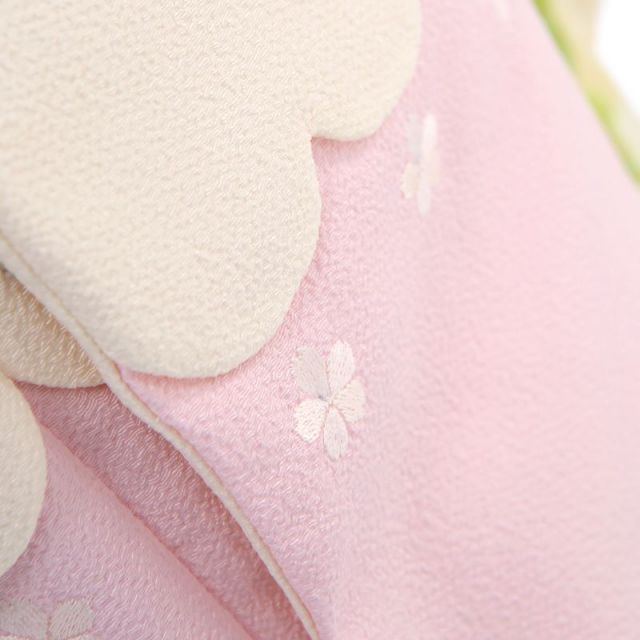 華やかに描かれた花々と、鮮やかな色遣いが、とても女の子らしい装いです。着物の地色は、優しく主張しない穏やかなクリーム色。そんな地色の上に、菊、牡丹、桜といった、古くから日本人が好んできた花々が描かれています。長寿を象徴する菊、富貴の花とも百花の王とも呼ばれる牡丹、いずれも縁起の良い花ですね。桜の花は、言わずと知れた、日本の花の代表です。花々と葉の色遣いは,ピンク、水色、黄色、黄緑と色とりどりですが、トーンが合わせられているため華やかでありながらまとまりがよく、また、懐の広い地色のクリーム色が、全ての色を受け止めてくれています。被布には、淡いピンク色のものを合わせました。柄付けがたっぷりとした着物を引き立てるよう、無地の被布を選んでいます。とはいえ、着物の華やかさと調和がとれるよう、丸い大きな襟、立体的な襟の飾りや被布飾りという、可愛らしい要素のある被布です。七五三らしい、華やかさと縁起の良さを兼ね備えた装いで、晴れの日をお迎えください。