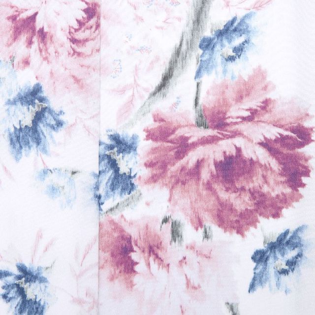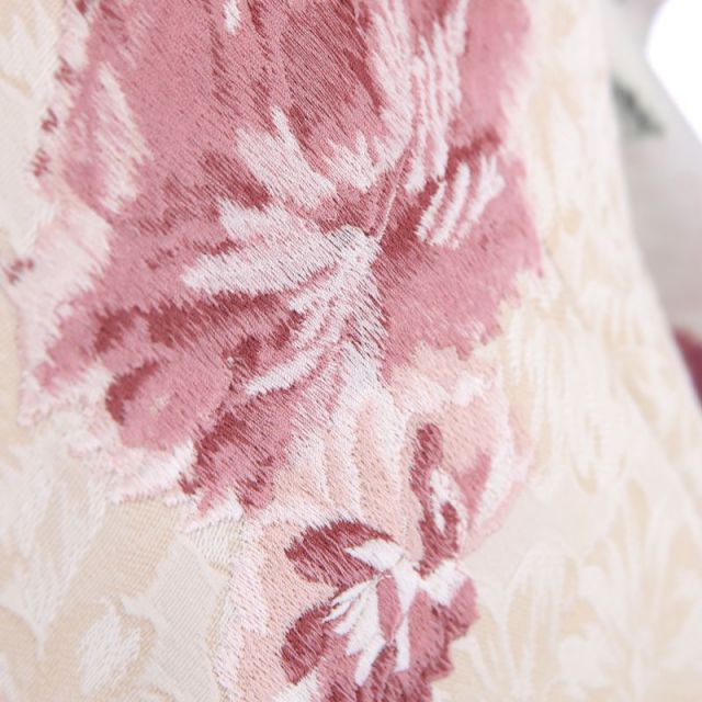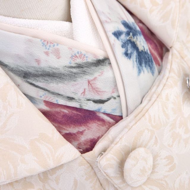華やかなワンピースを思わせるような、クールかつ甘い雰囲気が魅力的な、着物と被布のトータルコーディネートです。地色は、ほとんど白に近いごく薄いグレー。そこに、大小様々に洋花が描かれています。花は、特定の花を思わせないようデザイン化されており、お洒落な雰囲気を漂わせます。花のサイズが大中小とまちまちであること、それらがバランス良く配置されていること、色も赤系と青系の色のトーンが合っていること、さり気ないように見えて、計算しつくされていることがうかがえます。被布は、着物より少し明るさのある、ややオレンジがかったベージュ地のもの。着物の雰囲気が、3歳のお嬢様に対してややクールすぎる印象になりそうなところ、被布のこの温かみのある色味がうまく中和してくれます。被布は襟がお顔のすぐ近くにくるので、このような色が入ることで、全体の印象や写真でのお顔映りを明るくしてくれる効果も。着物に描かれているものと同じ花を同じ色で、数少なくポイント的に入れており、柄がしっかりの着物と、すっきりした被布で、とても完成度の高いコーディネートです。お顔立ちや雰囲気を考えると、強い色よりはクールな色味が似合いそう、そんなお嬢様にお薦めの装いです。