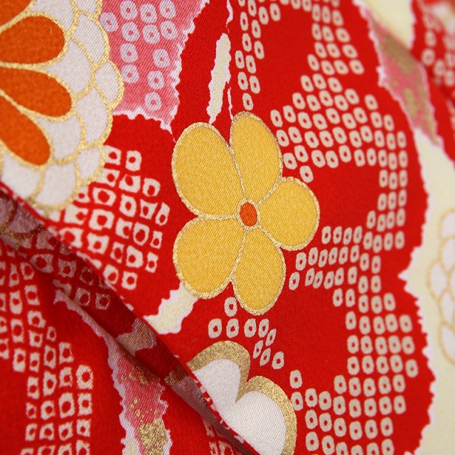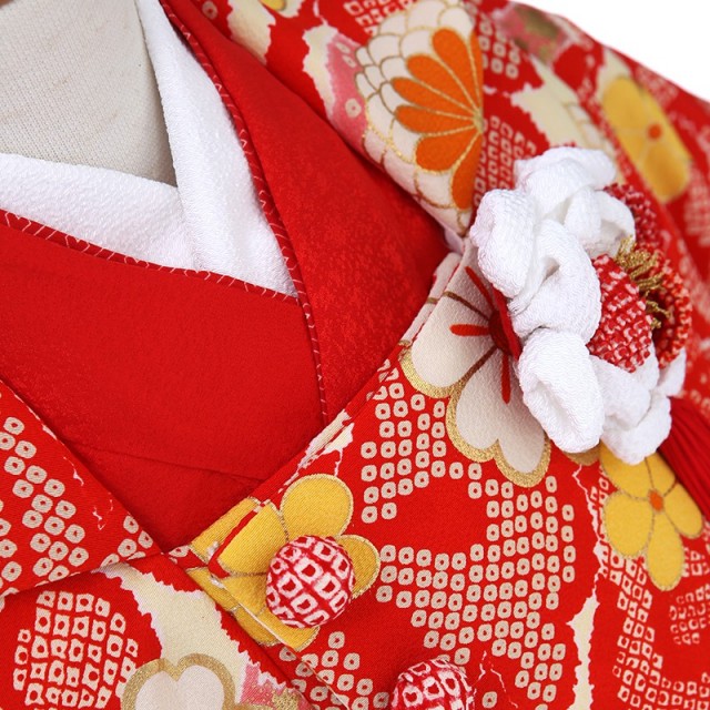 鮮やかな「赤色」が目を惹きつける一着。赤色は厄を払う意味があります。また太陽の色とされ、農耕民族であった日本人にとって「恵みの象徴」とされており、生命力や活力を表します。昔からおめでたい席には紅白が使われてきました。非常に縁起のいい色なので、女の子の晴れ着によく使用され、古くより親しまれています。正統派な印象を与え、凛とした装いが出来るので、正式な通過儀礼にはきちんとした正装がしたい、という方に是非選んでいただきたいです。被布には縁起のいい吉祥文様の植物が豪華に描かれます。「松竹梅」は慶事のシンボルとされる3点セット。「松」は冬の間も美しい緑を保ち、「竹」は雪に負けずに真っすぐと高く育ち、「梅」は厳しい冬のあといち早く美しく香り高い花を咲かせます。これらは逆境にも負けない力強さを表しており、人生の中で辛く厳しいことがあっても乗り越えてほしいという願いが込められます。「桜」は咲き誇る姿から豊かさや繁栄を、「菊」は放射線状を描く姿から太陽を連想させ、最も位の高い花とされ高貴さを表現します。そして細かく描かれる「鹿の子絞り」で奥行きが出て更に豪華な印象を与え、躍動感のある美しさと上品さを醸し出します。これぞ晴れ着と呼ぶに相応しい色彩と吉祥文様。普段とは違う格式のある着物にお祝いの想いを込めて、大切な一日にしてください。