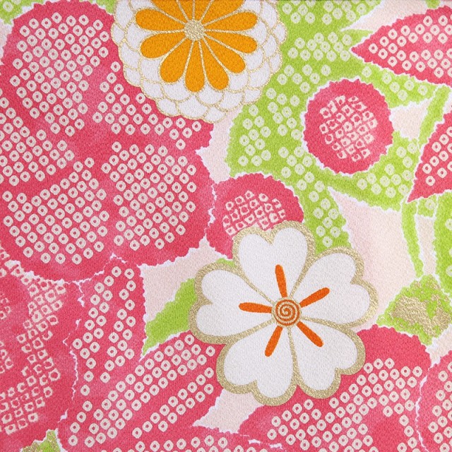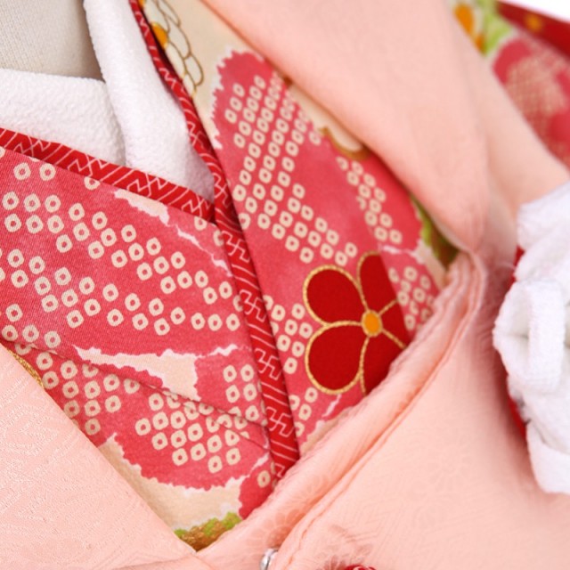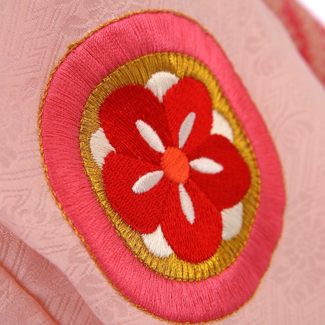 なんと輝かしく美しい着物でしょうか。着物の色は「桃色」と呼ばれる鮮やかなピンク。その名の通り桃の花のような色で、古くから親しまれる伝統色です。そこに明るい黄緑「若菜色」がアクセントカラーになっています。初春の若菜のような色味で、幼い子の晴れの日のお祝いにぴったりです。そして被布の色は「乙女色」と呼ばれる淡い薄いピンク色。八重咲の花をつける乙女椿が由来した色で、花言葉は「控えめな美」。3色とも可愛い色名から分かるように、女の子らしい華やかで鮮やかな色使いがされています。描かれる文様も、おめでたい古典的な吉祥文様。被布の「丸紋」は、円は始まりと終わりがないことから永遠に続く幸せを意味します。そして「円=縁」を意味し、ご縁に恵まれるよう願いが込められた文様です。着物に描かれる「松竹梅」は、厳しい冬でも美しい緑を絶やさない「松」、雪に耐えて真っすぐ成長する「竹」、冬が終わるといち早く花を咲かせる「梅」、これらは逆境に負けない力強さを表します。また咲き誇る「桜」は、繁栄や豊かさ、太陽のように咲く「菊」は高貴さを意味します。若々しく美しいこちらの着物。キラキラ輝かしい装いは、大切なお祝いに華を添えてくれるでしょう。