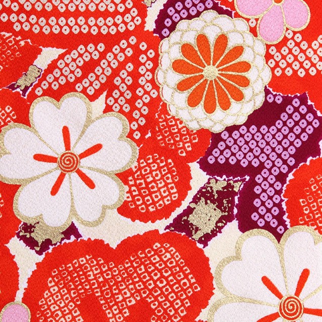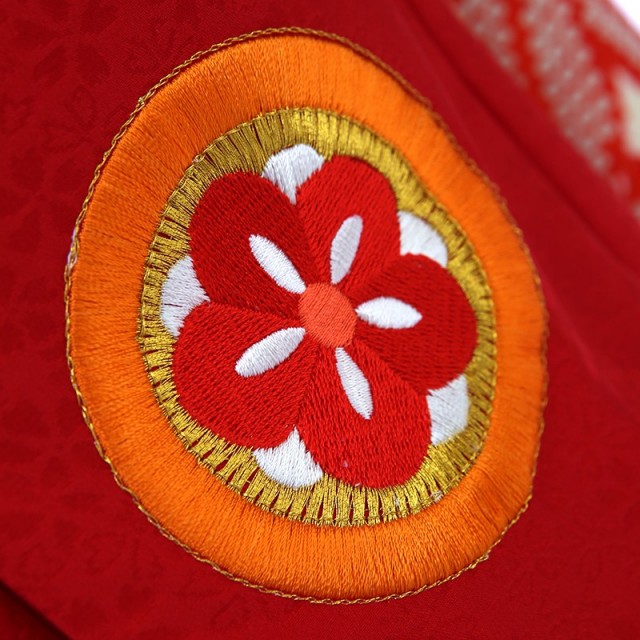 古典的な色彩とデザインが非常に可愛らしいこちらの着物。全体に「赤色」が使用されています。赤色は、厄除けの意味を持ち、また太陽の色を連想させ、「恵みの象徴」とされており、生命力や活力を表します。非常に縁起が良く、女の子らしさだけではく、上品さ凛々しさを感じます。やはりきちんとしたお祝いの日だからこそ、古典的で正統派な着物はおすすめです。見飽きることなく、何年経っても色褪せない落ち着いた美しさがあります。そして着物の紫色がアクセントカラーになっていて「京紫」と呼ばれる、京都で流行した雅な雰囲気の色で、更に高貴さを感じます。描かれる文様は縁起のいい吉祥文様で、一つずつ大切な意味があります。厳しい冬でも美しい緑を絶やさない「松」、雪に耐えて真っすぐ伸びる「竹」、冬の後いち早く花を咲かす「梅」、松竹梅は逆光に負けない力強さを表します。咲き誇る姿が美しい「桜」は繁栄や豊かさ、太陽のように咲く「菊」は高貴さを表します。被布の「丸紋」は、円は始まりと終わりがないことから永遠の幸せを指し、ご縁に恵まれるように願いが込められます。古き良き伝統スタイルは日本ならでは。正統派な装いで、素敵な晴れの日をお迎えください。