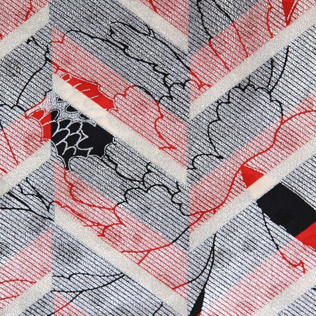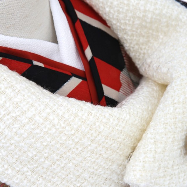 恰好良いオーラを放つこちらの晴れ着。一定間隔で綾目が右上がり左上がりを繰り返すジグザグのような文様は「杉綾」と呼ばれる江戸文様です。杉綾は杉の葉の形が由来していて、黒、白、赤の色彩で描くことでモダンで垢ぬけた印象を与えます。その上に描かれる文様は、大きな「牡丹」の花。牡丹は古くより美しい女性に例えられ、また百花の王とされ、高貴さ、豪華さを表し、幸福のシンボルとされてきました。そして牡丹の「丹」は不老不死の仙薬を意味することから、長寿の意味もあります。透け感のある白で描くことで奥行きや立体感が出て、クールな格好良さだけでなく、柔らかい優しい印象に仕上がっています。淡いベージュの被布を重ねることで、さらに抜け感が出てバランスが非常に計算されています。上質なツイード生地で高級感もアップ。粋でおしゃれな着物ですが、描かれる花は慶事の象徴とされる吉祥文様。他とは違った個性的な装いで、大人っぽく着ていただける一着です。可愛らしさよりも、クールでモダンな雰囲気が好きな方に非常におすすめ。大人な着こなしは普段の幼さとはまた違った表情を楽しんでいただけるでしょう。