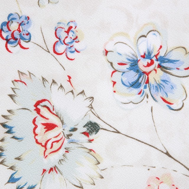女性らしい優しいペールカラーが上品で控えめな美しさを感じさせます。清楚なアイボリーの着物に、赤や淡い青で花々が描かれているこちらの着物。被布も繊細なレースが使用されているので、更に格の高さを感じます。デザインが古典すぎずに、お洒落な洋風の雰囲気に仕上がっており西洋の文化も感じます。描かれている花々には優美で清々しい美しさがあります。女の子らしく可愛い花文様は、可憐な印象を与えます。色彩も淡く、文様の描かれ方も繊細で、まるで大人着物のような格調の高さ。普段とは違った大人っぽい装いは、特別な日だからこそ着ていただけます。まだまだ小さい我が子が少しお姉さんに見えて、何かこみ上げてくるものがあるのではないでしょうか。フェミニンでセンスの良い美しい着物に、これからの健やかな成長と幸福の願いを込めて、素敵な1日をお迎え下さい。