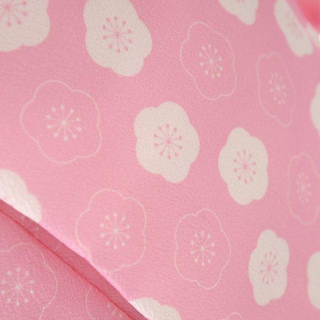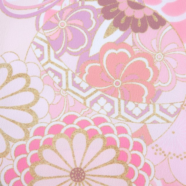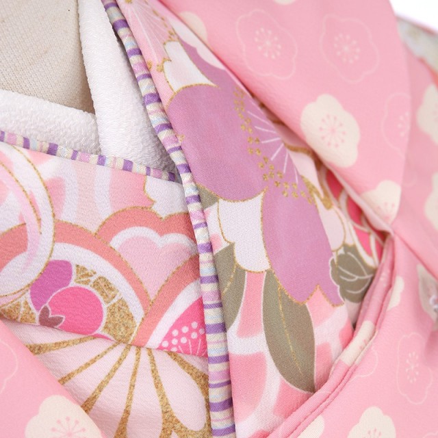 淡いピンク色は「桜色」。その名の通り桜の花のようなごく薄いピンク色です。柔らかく女性らしい色彩で非常に可愛らしく仕上がっています。被布には「梅」の文様が細かく描かれています。厳しい冬が終わるといち早く香り高い花を咲かすことから、逆境に負けない力強さ、忍耐力、生命力を表しています。着物にも美しく縁起のいい花々が沢山描かれます。「桜」は、咲き誇る姿から繁栄や豊かさを表しており、また春に咲くことから新しい門出を意味します。「菊」は、形が太陽を連想させ、最も位の高い花とされてきました。華やかですが、上品な美しさを感じるこちらの着物。愛らしい着姿は、幸せな気持ちにしてくれます。可愛い色彩と、可憐な花々の文様で、これぞ女の子の晴れ着ではないでしょうか。着物に込められた意味を知ると、更に思い入れが強くなり気に入っていただけることでしょう。上品さと可愛さが合わさったこちらの着物、大変おすすめしたい一着です。