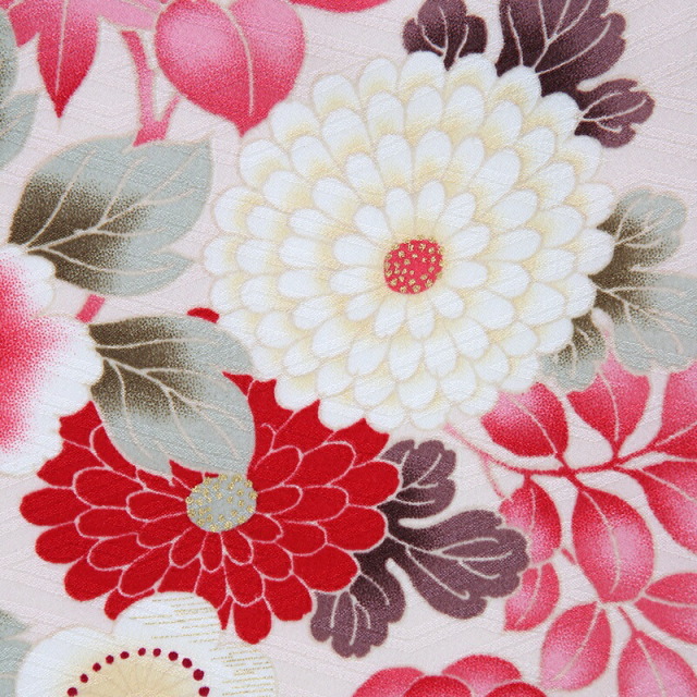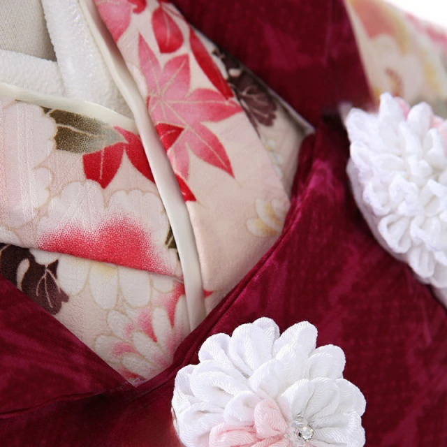 ベロア生地のような被布は、高級感があり、色も上品な赤色。「海老色(えびいろ)」と呼ばれる伝統色で、伊勢海老の殻ような深く渋い赤色です。着物には縁起のいい古くから伝わる吉祥文様が豪華に描かれます。大輪の花が美しい「牡丹」は、「百花の王」とされ、幸福や富貴の象徴とされています。また不老不死、長寿という意味も込められています。昔から美しい女性を象徴する花とされていたので非常に華やかな存在です。「菊」は太陽のように咲く姿から最も位の高い花とされ、高貴さをあらわします。紅葉が美しい「楓」は長寿を表します。 また季節により色を変え、美しい色で人を喜ばせてくれることから、世渡りがうまく幸せになれるという意味が込められています。色使いも赤やピンク系で非常に可愛らしく仕上がっており、子どもの成長を願う大切な日に是非おすすめしたい一着です。おめでたい文様も沢山描かれ、人生の大切なお祝いのシーンに華を添えてくれることでしょう。