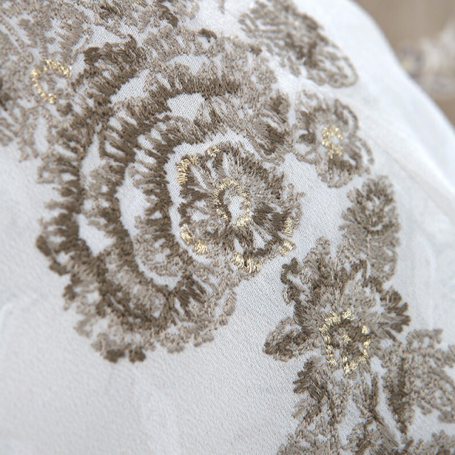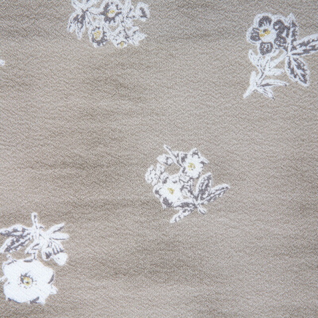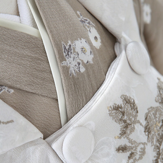 落ち着きのある上品なくすみカラー。大人っぽく、他とは違う自分らしいお洒落な装いをしていただけます。着物地の薄茶色は「亜麻色(あまいろ)」と呼ばれます。亜麻を紡いだ糸の色のような黄色がかった薄茶色。明治以降に使われるようになった比較的新しい色で、上品さを感じます。被布の色は「生成色(きなりいろ)」が使用されています。晒す前の木綿のような黄みの白色で、馴染みのよいナチュラルカラーです。着物地の文様は、特定されるものではなく抽象的な小花柄が描かれているので、流行りや季節関係なく着用できます。控えめな印象が魅力のこちらのお祝い着。決して地味ではなく、上品で繊細な美しさがあります。おめでたい席に品位ある大人っぽい装いを好まれる方に相応しい一着に仕上がりました。