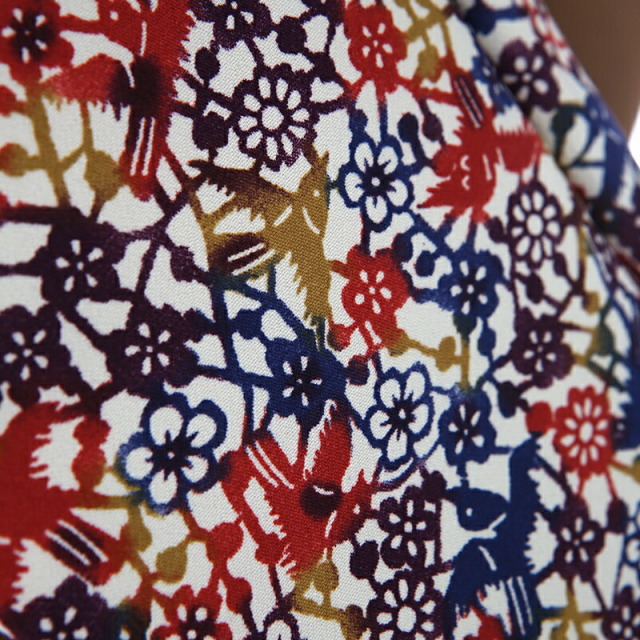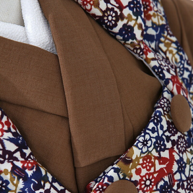 琉球紅型のような被布が魅力のこちらのお祝い着。あまり目にすることがない人とは被りにくい個性溢れるデザインになっています。着物地の落ち着いたカラーは、「鶯茶(うぐいすちゃ)」と呼ばれる色で、鶯の羽のような褐色がかった渋みのある茶色。江戸時代には落ち着いた色合いとして、女性の着物に愛用された伝統色です。被布の色使いは、青、赤、黄色の大胆な配色が魅力。文様は素朴さもあり、日本らしい優美さも感じます。花や鳥が描かれた文様は、南国の風景が浮かび、自然の美しさを表しているよう見えるもので、あたたかい気持ちになる一着です。独特な鮮やかな色彩、繊細な文様から長い歴史を感じさせます。日本の伝統を感じる装いは、古くから伝わるお祝いのシーンにぴったりです。