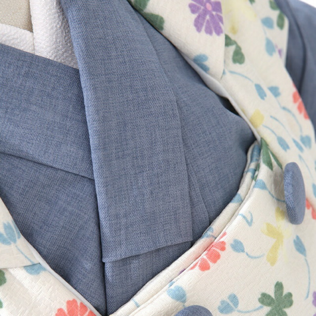 着物地はグレーで落ち着いた印象ですが、被布の草花の色使いが華やかで可愛らしい装いです。着物地の色は、「錫色(すずいろ)」と呼ばれる伝統色。銀色に近い明るい鼠色のことで、大人っぽい上品さがあります。被布は草花の文様で、特定されるものではなく、抽象的に描かれています。季節を問わず通年で着ていただけるのでおすすめです。草花の文様は、赤、紫、青、黄、緑と多色が使用されていますが、彩度が高過ぎずにふんわりと柔らかい色で統一されています。派手すぎずに全体的にまとまりの良い印象です。着物の大人っぽさと、重ねる被布の可愛らしさ、絶妙なバランスを感じる一着です。