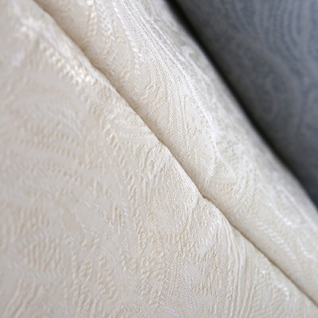 大人の女性着物のような控えめな美しさ、他とは被らないデザインです。着物地の落ち着いたグレーは「銀色」です。銀色は白金とも呼ばれる、美しい金属光沢のある灰色のことです。銀は古来から愛されてきた金についで貴重な金属とされてきました。美しく上品な色味で、純粋無垢という意味があります。文様は、特定されるものではなくアンティーク着物のような雰囲気に仕上がっています。被布の色は肌馴染みのいいナチュラルカラー「生成色(きなりいろ)」。こちらのお祝い着は派手すぎずに、上品で落ち着いた可愛さが魅力です。レトロモダンな着物で、通好み渋めな色使いですが、胸に添えられたつまみ細工のコサージュで華やかさをアップさせ、非常にバランスがよく仕上がっています。