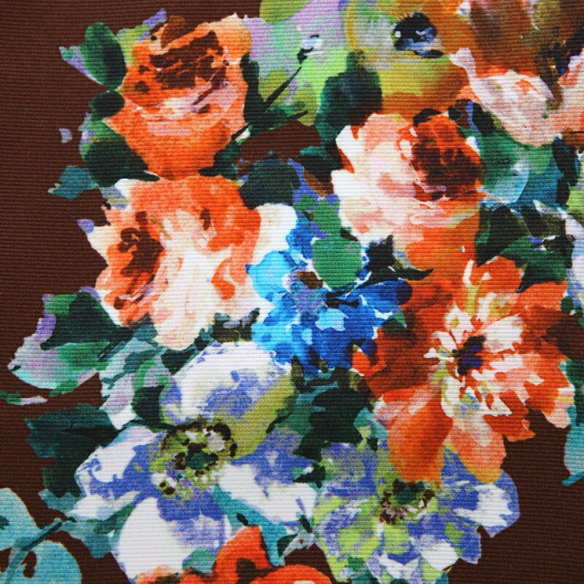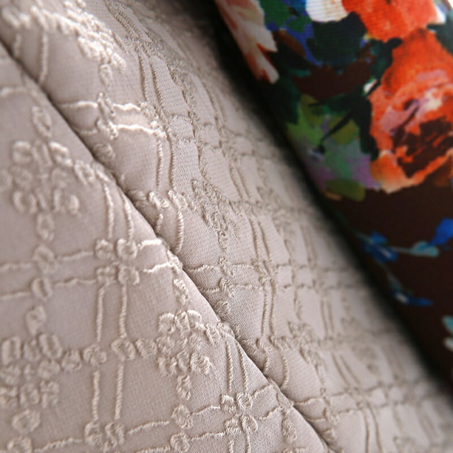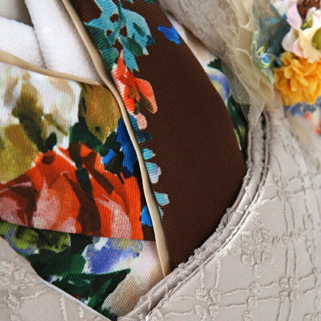 シックで大人っぽい雰囲気ですが、豪華な花々の文様がよく映える華やかなお祝い着の紹介です。着物地の綺麗な茶色は「栗皮茶(くりかわちゃ)」と呼ばれ、栗の実の皮のような黒みがかった赤褐色です。深みのあるカラーで上品な印象を与えます。文様は古典的というよりも、西洋の絵画のような繊細で柔らかいタッチで描かれます。大輪の花が特徴の「牡丹」は、「百花の王」とされ、幸福や富貴の象徴とされています。また不老不死、長寿という意味もあります。昔から美しい女性を象徴する花で、豪華で華やかな印象を与えます。美しい「薔薇」は、愛と美の象徴です。可憐な花々が描かれ、エレガンスで女性らしさを引き立ててくれます。可愛さと上品さが合わさった、特別な日におすすめの装いです。