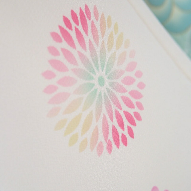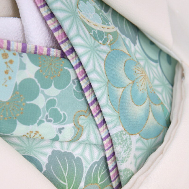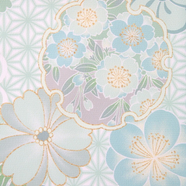 淡く優しいカラーが癒される女の子のお祝い着です。「薄緑(うすみどり)」は、その名の通り薄い緑色のこと。柔らかい雰囲気を好まれる方におすすめのカラーです。文様は、レトロなタッチで可愛らしく描かれており、縁起のいい意味が込められた伝統的な吉祥文様です。「雪輪」という、雪の結晶を花に見立てた文様は、豊作や子孫繁栄を願って使われます。雪輪の中にも花々が描かれていて、格調の高さを感じます。「桜」は、咲き誇る姿から繁栄や豊かさを表しており、また春に咲くことから新しい門出を意味します。「菊」は、太陽の形に似ていることから、最も位の高い花とされてきました。「梅」は、厳しい冬が終わるといち早く香り高い花を咲かすことから、逆境に負けない力強さを表します。可愛い花々が全体に描かれ非常に華やかですが、ふわっとした柔らかい雰囲気がこちらの着物の魅力です。大切な晴れの日にそっと華を添えてくれる一着です。