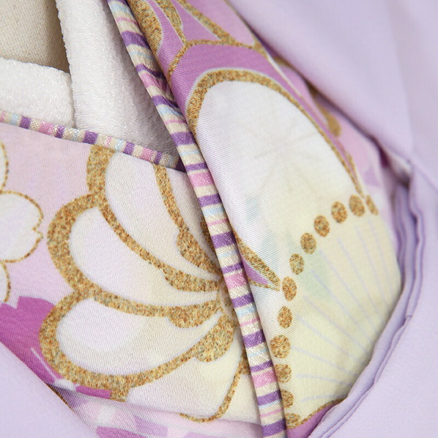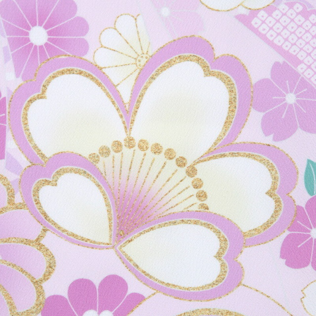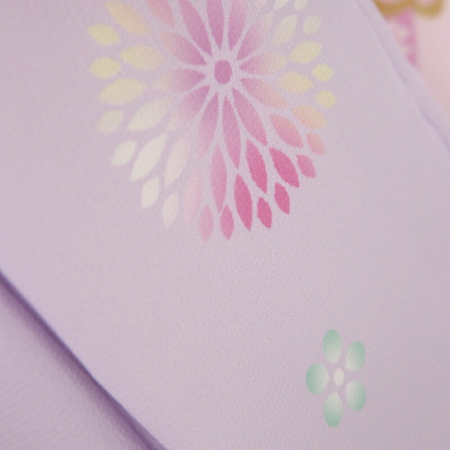 上品で大人っぽいパープルの地色に、古典的で可愛い文様が華やかに描かれます。地色は「薄藤(うすふじ)」。藤色をより薄くした淡い紫色のことです。平安の頃より日本女性の着物の色として人気での格調高き伝統色です。そしておめでたい意味が込められた美しい花々が、女の子着物らしく可愛く描かれます。「梅」は、冬が終わると香り高い花をいち早く咲かせることから、逆境に負けない力強さ、生命力を表しています。「菊」は、太陽のように咲く姿から最も位の高い花とされ、高貴さをあらわしています。「桜」は、冬を越え咲き誇る圧巻の佇まいは、春がはじまる歓びをもたらします。幸先の良い物事のはじまりという前向きな意味が込められています。大切の想いを着物に託して、お祝いにシーンに華を添えてくれます。伝統的な色彩と文様、上品さと可愛さをミックスした華やかな一着に仕上がりました。