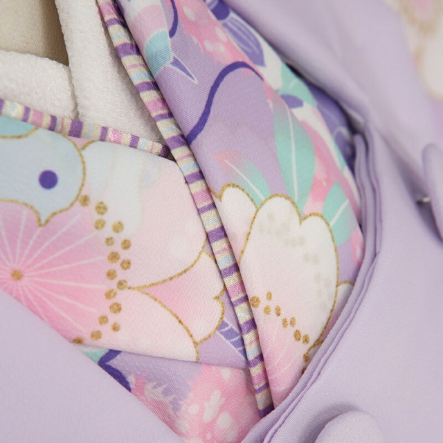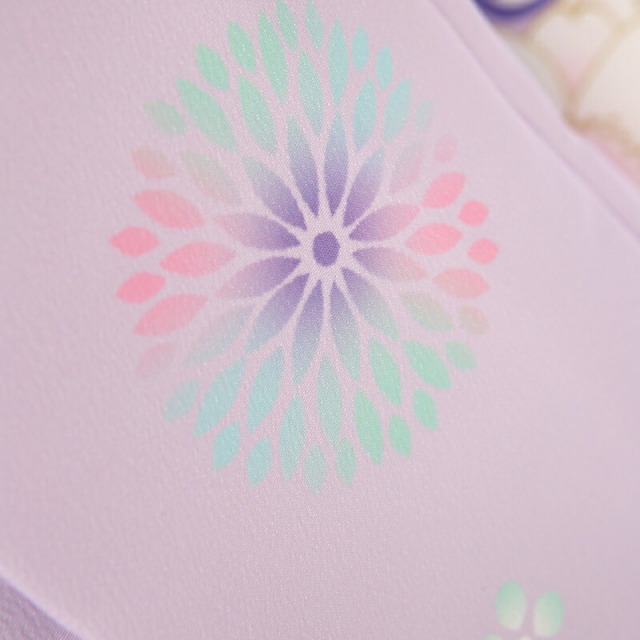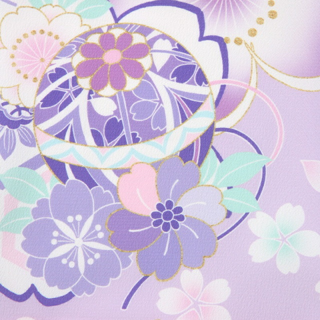しっとりとした上品な色味で、格調の高さを感じます。着物の地色は「薄藤(うすふじ)」。藤色をより薄くした淡い紫色のことです。平安の頃より日本女性の着物の色として人気の伝統色です。そしておめでたい意味が込められた古典的な吉祥文様が描かれます。「手毬」は平安時代に貴族の遊び道具だったことから高貴さや上品さの象徴とされています。また何事も丸く収まるように、丸く大きく成長しまうようにと願いが込められています。「桜」は、冬を越え咲き誇る圧巻の佇まいは、春がはじまる歓びをもたらします。幸先の良い物事のはじまりという前向きな意味が込められています。「梅」は、冬が終わると香り高い花をいち早く咲かせることから、逆境に負けない力強さ、生命力を表しています。見ているだけで癒される落ち着いた美しさ。上品なデザインで、大人っぽい表情と着姿を見ていただけます。特別な日に相応しい装いになりました。