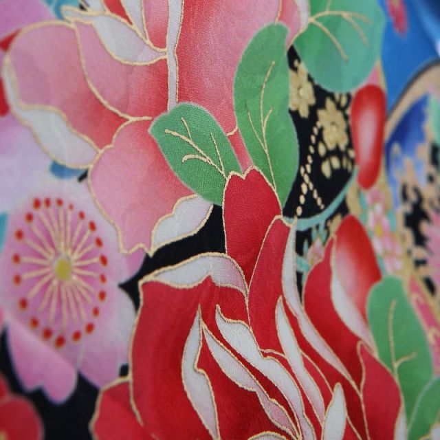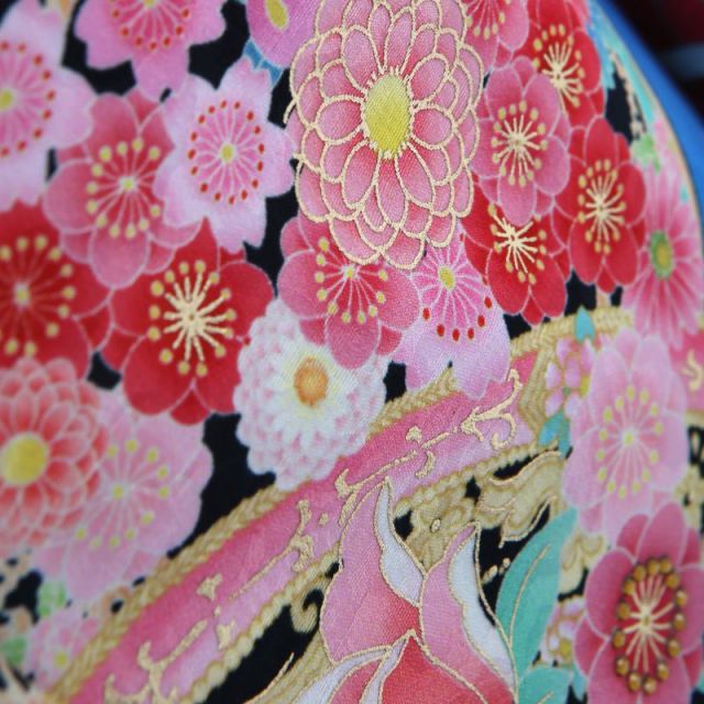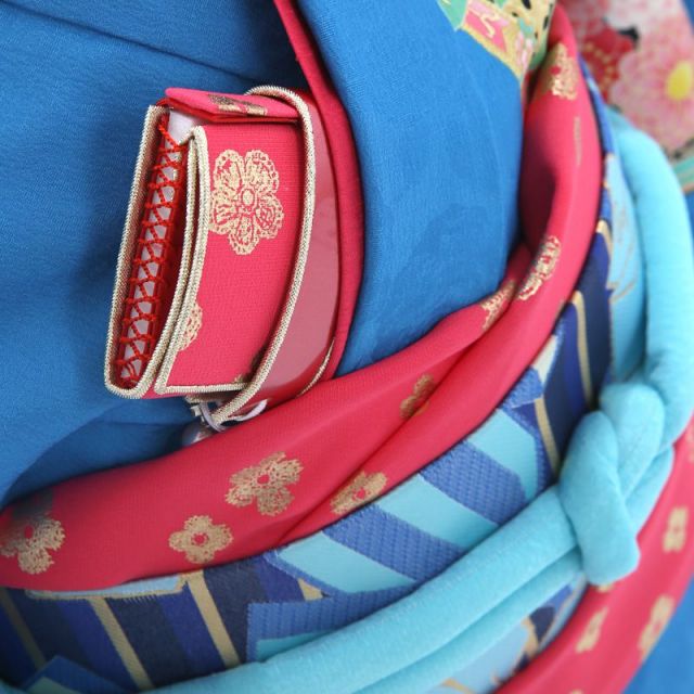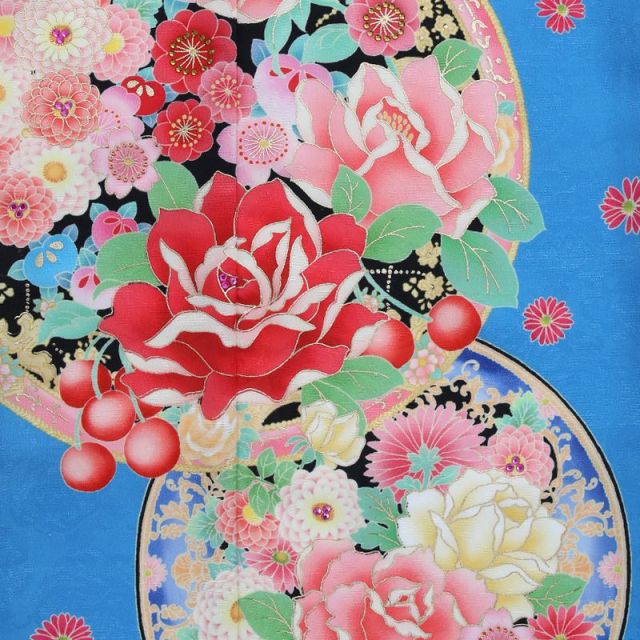 ブルーを基調としたこのカラーは、清楚で大人っぽい印象のあるお着物。大人から見たらまだまだこどもと思えても、もう立派なレディだと思っているお嬢さんも多いでしょう。そんなおしゃれなおませさんにもぴったりの1枚です。全体には、小さな赤い菊が小紋調にあしらわれて、かわいらしい印象です。裾や袖、左胸には大きな円を縁取りにバラやさくらなどの花々とさくらんぼがあふれんばかりに描かれています。和のお花や植物はそれぞれ表す季節が決まっていて、その季節に着るのがよいとされていますが、さくらだけは例外で1年を通して着ることのできる柄です。バラなどの洋花がデザインされたお着物も季節を問わずいつでも着ることができます。中央の大きな円のところには西洋の鏡の縁取りに使われているようなデザインが施されています。バラなどのお花の一部にはきらきらと光るラインストーンも。一見すると和のテイストのお着物のように見えますが、細部にはさりげなく洋の要素も取り入れられていてエレガントさを演出しています。帯の下のところに巻かれているものを「しごき」といいます。こちらのお着物では、帯揚げとしごきが同じ色やデザインが使われています。ピンクのベースに金の柄がかわいらしく、ブルーのお着物とのコントラストもすてきです。