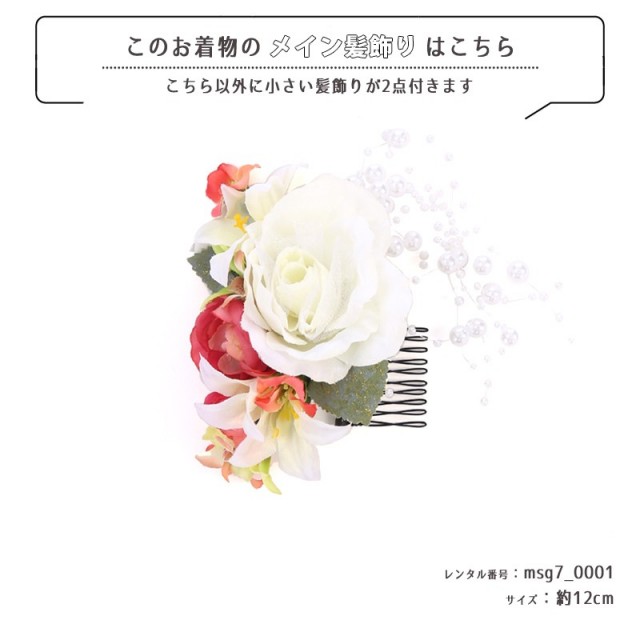 | 付属品 | 女の子七五三(7歳女の子用)に含まれる物:着物、長襦袢(カット袖)、作り帯、草履、バッグ、帯揚げ、箱迫、帯〆、しごき、末広(扇子)、足袋、腰紐(3本)、コーリンベルト、伊達締め、髪飾り |