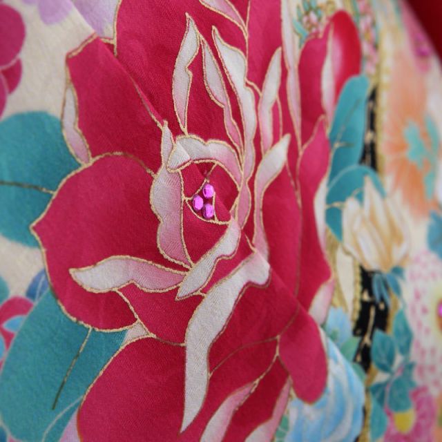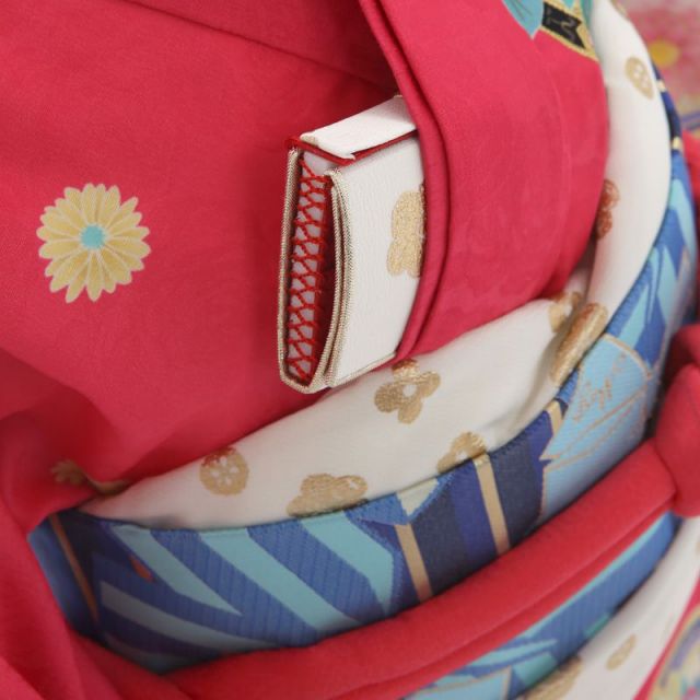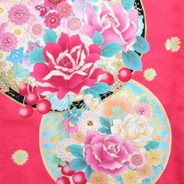 ローズピンクのように品のあるピンク色を基調としたこのお着物は、かわいらしさが際立つデザインです。黄色い小さな菊がお着物全体に小紋調にあしらわれいます。裾や袖、左胸には、大きな円を縁取りに大輪のバラやさくらなどの花々とお着物の柄には珍しいさくらんぼが描かれていて、とても豪華です。和のお花や植物はそれぞれ表す季節が決まっていて、その季節に着るのがよいとされていますが、さくらだけは例外で1年を通して着ることのできる柄です。バラなどの洋花がデザインされたお着物も季節を問わずいつでも着ることができます。中央の大きな円のところには西洋調のデザインが施され、バラなどのお花の一部にはラインストーンも飾られています。歩いたりお写真を撮ったり、光が当たるごとにきらきらと輝き、華やかです。洋のデザインが多く用いられているので、プリンセスになりたいと思っているお嬢様にも満足いただけるのではないでしょうか。帯の下のところに巻かれているものを「しごき」といいます。こちらのお着物では、帯揚げとしごきが同じ色やデザインが使われています。白のベースに金の柄がお着物にもよく映え、同時にお着物の豪華さや華やかさをさらに引き立てます。