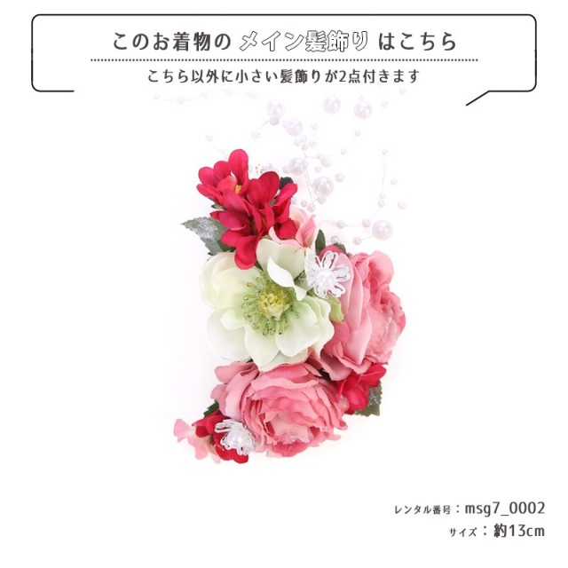 | 付属品 | 女の子七五三(7歳女の子用)に含まれる物:着物、長襦袢(カット袖)、作り帯、草履、バッグ、帯揚げ、箱迫、帯〆、しごき、末広(扇子)、足袋、腰紐(3本)、コーリンベルト、伊達締め、髪飾り |