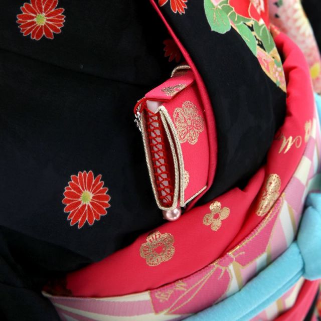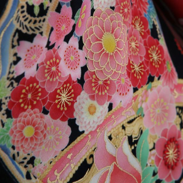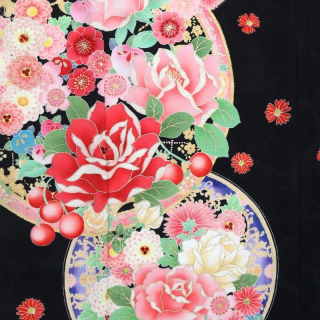 一番最初に目に飛び込んでくるのは、なんといっても基調の黒。シックで深い黒がお着物全体の印象を引き締めます。そして、その黒い地色に浮かび上がるように描かれたお花がとっても印象的で華やかです。全体には、小さな赤い菊が小紋調にあしらわれていて、シックな中にもかわいらしさをプラスします。裾や袖、左胸には大きな円を縁取りに大輪のバラやさくらなどの花々とさくらんぼが描かれています。まるでいまにも花かごからこぼれおちそうというほどのたくさんの花々がとても豪華です。中央の大きな円のところには西洋の鏡の縁取りに使われているようなデザインが施されていて、バラなどのお花の一部にはきらきらと光るラインストーンもあしらわれています。遠くからではわかりにくいかもしれませんが、細部にまで美しさにこだわってデザインされた1枚です。帯の下のところに巻かれているものを「しごき」といいます。こちらのお着物では、帯揚げとしごきが同じ色やデザインが使われています。ピンクのベースに金の柄が描かれ、シックな黒のお着物にも七歳らしいかわいらしさを添えています。