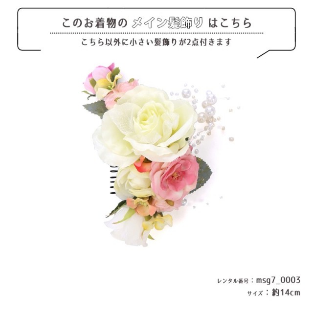 | 付属品 | 女の子七五三(7歳女の子用)に含まれる物:着物、長襦袢(カット袖)、作り帯、草履、バッグ、帯揚げ、箱迫、帯〆、しごき、末広(扇子)、足袋、腰紐(3本)、コーリンベルト、伊達締め、髪飾り |