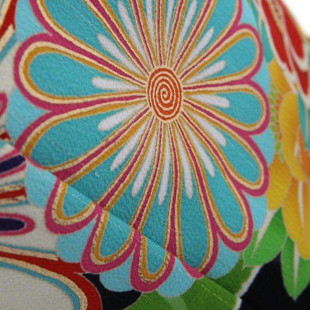 赤がベースのお着物と色ちがいのお着物ですが、ベースの色と差し色がちがうだけでこんなにもちがうものかと思うほど印象の異なるお着物です。黒がベースなので、全体的に大人っぼく落ち着いた雰囲気のあるお着物。かわいらしさだけでは物足りないというお嬢さんや背の高いお嬢さんにもおすすめの1枚です。着物の柄には大小の菊をはじめ、季節の花々が隙間がないほどたくさん描かれています。白や赤の花が黒地生えてとっても華やかです。伝統的な古典風のデザインですが、裾や袖から見える八掛の部分と伊達えりには白と黒のモノトーンのデザインが使われています。ほんの少し見えるだけですが、これだけでぐっとモダンな印象になりますね。帯締めも八掛や伊達えりのようにモダンなデザインですが、こちらは白と黒に加えて紫も入っているので、高貴でシックな雰囲気にまとまっています。