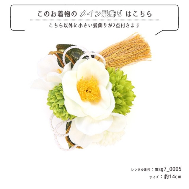 | 付属品 | 女の子七五三(7歳女の子用)に含まれる物:着物、長襦袢(カット袖)、作り帯、草履、バッグ、帯揚げ、箱迫、帯〆、しごき、末広(扇子)、足袋、腰紐(3本)、コーリンベルト、伊達締め、髪飾り |