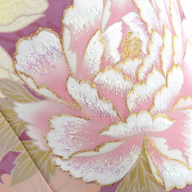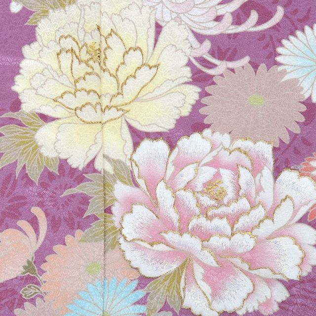お着物の紫は、「高貴」な色であり、「優雅さ」や「艶やかさ」の象徴とされています。光沢のある紫の地模様には可愛らしい花があしらわれ、そこに華やかな花々が惜しみなく描かれています。“牡丹”の花は小さな丸いつぼみが、やがて大輪になることから「幸福」や「豊かさ」を表します。その輪郭には金の刺繍がほどこされ、“百花の王”牡丹の美しさをさらに引き立てています。“菊”はとても香りがよく、天皇家の紋章にも使われる格調高く美しい花です。「高貴」「長寿」「邪気払い」「心身の安定」を意味します。牡丹、菊の大輪を引き立てるように可愛らしく描かれている“桜”や“鉄線花”もとても華やかです。春になるといっせいに咲き誇る“桜”は、「豊かさ」や「繁栄」を願う意味がこめられています。お着物の裾に描かれている“鉄線花”は優美な姿から紋章に多く取り入れらた花です。かたく丈夫なつるを持ち、それぞれが固く結びついていることから「良縁」を意味しています。水色の帯と明るい色の“帯揚げ”と“しごき”が上品ななかにも子供らしい可愛らしさをプラス。可愛いお子様の笑顔を引き立たせる素敵な一着です。