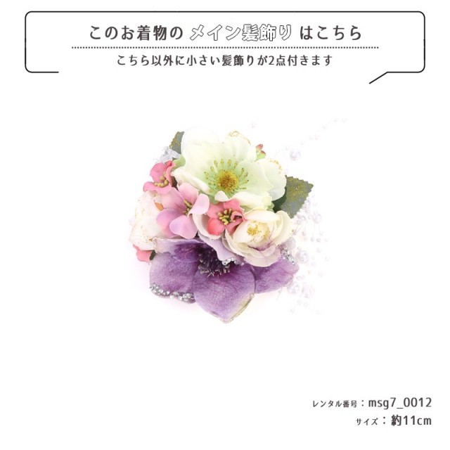 | 付属品 | 女の子七五三(7歳女の子用)に含まれる物:着物、長襦袢(カット袖)、作り帯、草履、バッグ、帯揚げ、箱迫、帯〆、しごき、末広(扇子)、足袋、腰紐(3本)、コーリンベルト、伊達締め、髪飾り |