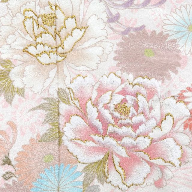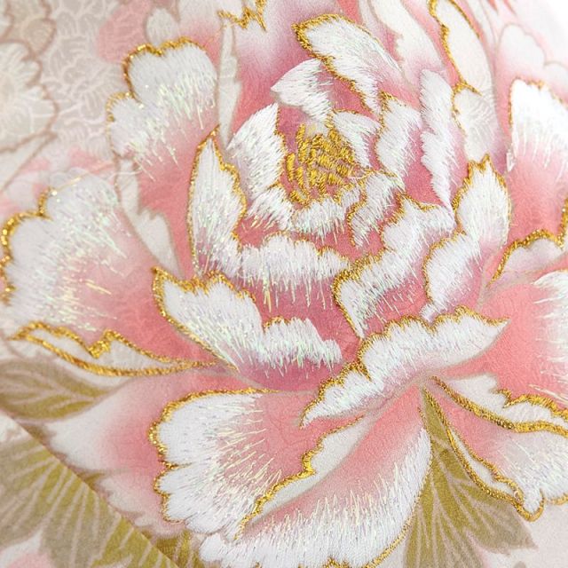 優しく可愛らしい薄ピンク色にお花の地模様がほどこされ、さらに大小さまざまな花が描かれています。一番に目を引くのが“牡丹”。花言葉は「高貴」「壮麗」「誠実」。牡丹は「百花の王」と呼ばれるほどに美しく風格のある花です。絹のように美しい花びらが幾重にも重なり、ふくよかに、そして優雅に咲きます。“菊”は花柄文様の中では品位が高く、皇室紋章にも用いられています。「不老不死」、「延命長寿」、「無病息災」、「邪気払い」の意味がある吉祥文様です。お着物全体にさまざまなお色で描かれています。お着物の裾に紫で描かれている“鉄線花”はその優美な姿から紋章に多く取り入れられ愛好されてきた花です。かたく丈夫なつるを持つことから、固い結びつき、良縁を意味しています。“桜”は春になるといっせいに咲き誇ることから、「豊かさ」や「繁栄」を願う意味がこめられています。花々がまるで女の子の幸せな未来を願うように、お着物の中で美しく咲き誇り、女の子の可愛らしさを引き立てます。お子様の成長を心から願うご家族の愛情とともに、晴れの日を飾る一着になることでしょう。