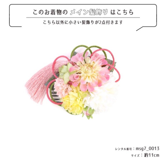 | 付属品 | 女の子七五三(7歳女の子用)に含まれる物:着物、長襦袢(カット袖)、作り帯、草履、バッグ、帯揚げ、箱迫、帯〆、しごき、末広(扇子)、足袋、腰紐(3本)、コーリンベルト、伊達締め、髪飾り |